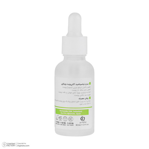 سایر توضیحاتحاوی 10% نیاسینامید که برای کنترل تولید و ترشح چربی می باشد . ضد جوش می باشد . کنترل کننده ترشح چربی و ضد عفونی کننده پوست می باشد . ترمیم کننده و تقویت کننده سد دفاعی پوست می باشد . مات کننده و کوچک کندده منافذ پوست می باشد . پایه مناسبی برای آرایش می باشد .